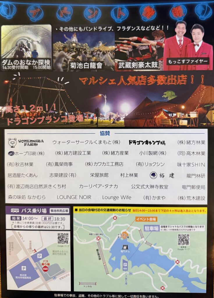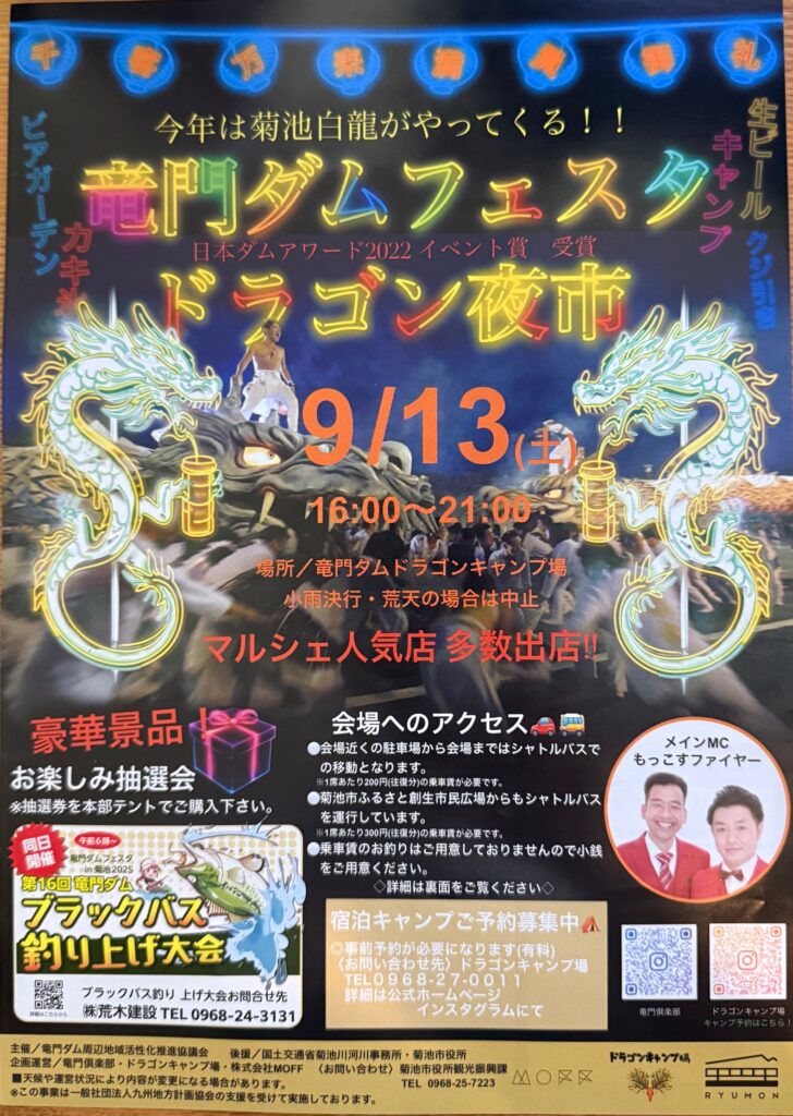 「竜門ダムフェスタ ドラゴン夜市2025」のお知らせ 2025.09.02 「竜門ダムフェスタ ドラゴン夜市」が下記日程で開催されます。日時:令和7年9月13日(土)16:00~21:00会場:竜門ダム ドラゴンキャンプ場 < 前の記事 お知らせの一覧へ