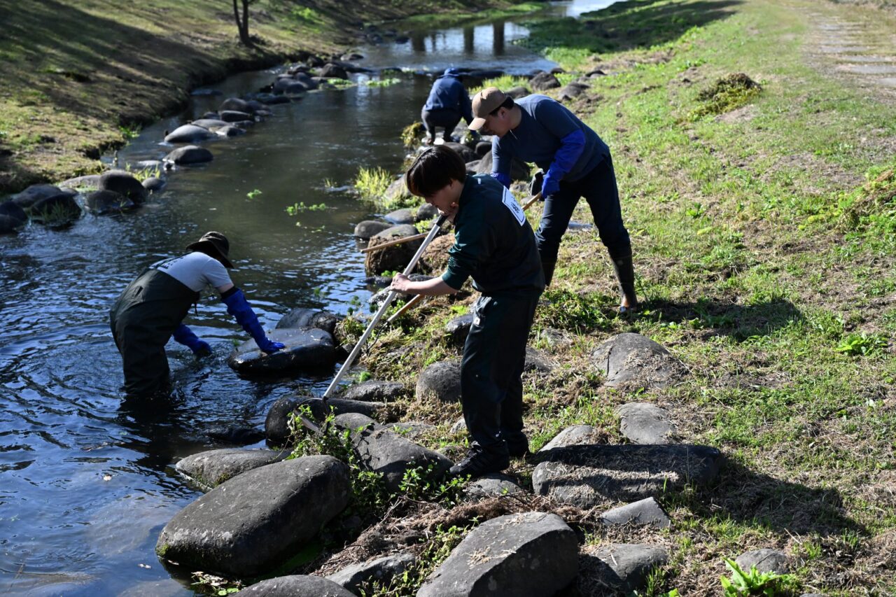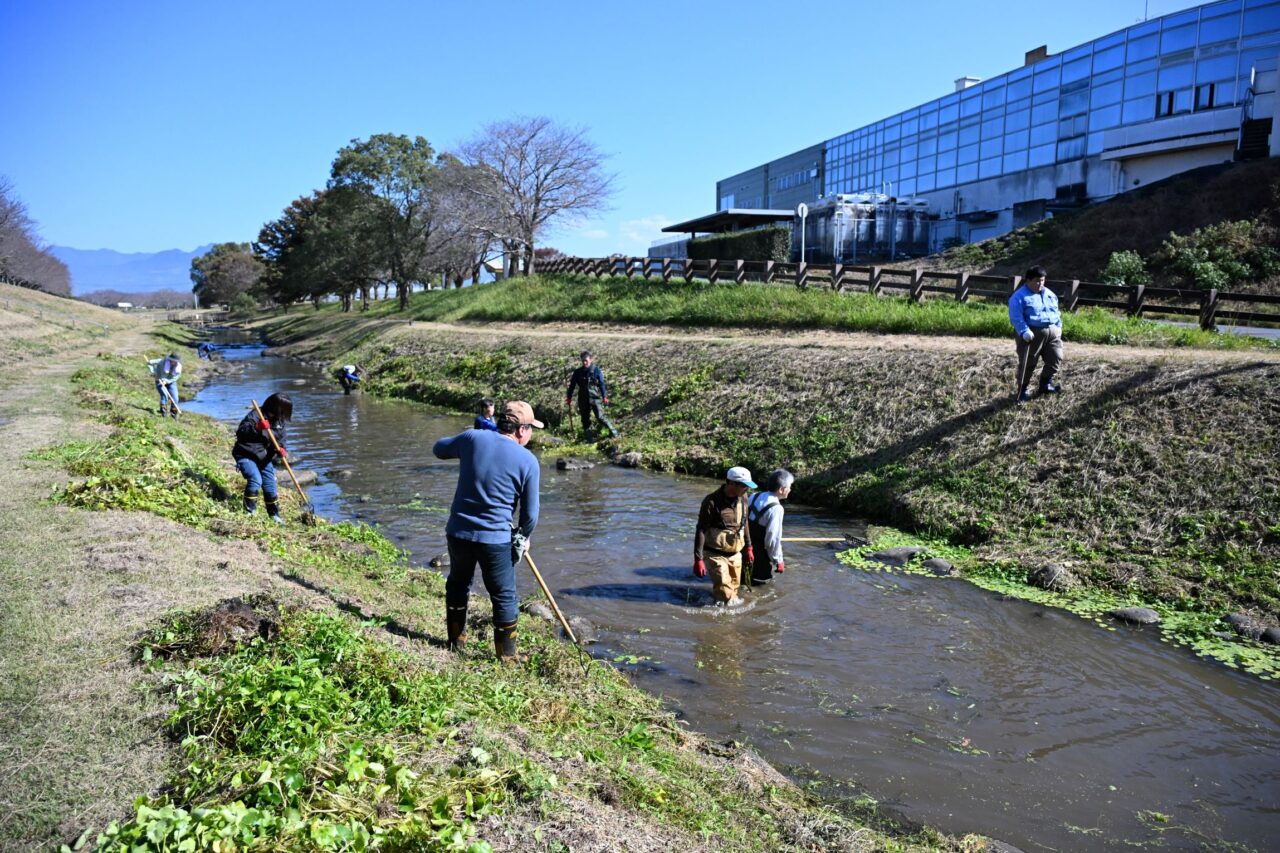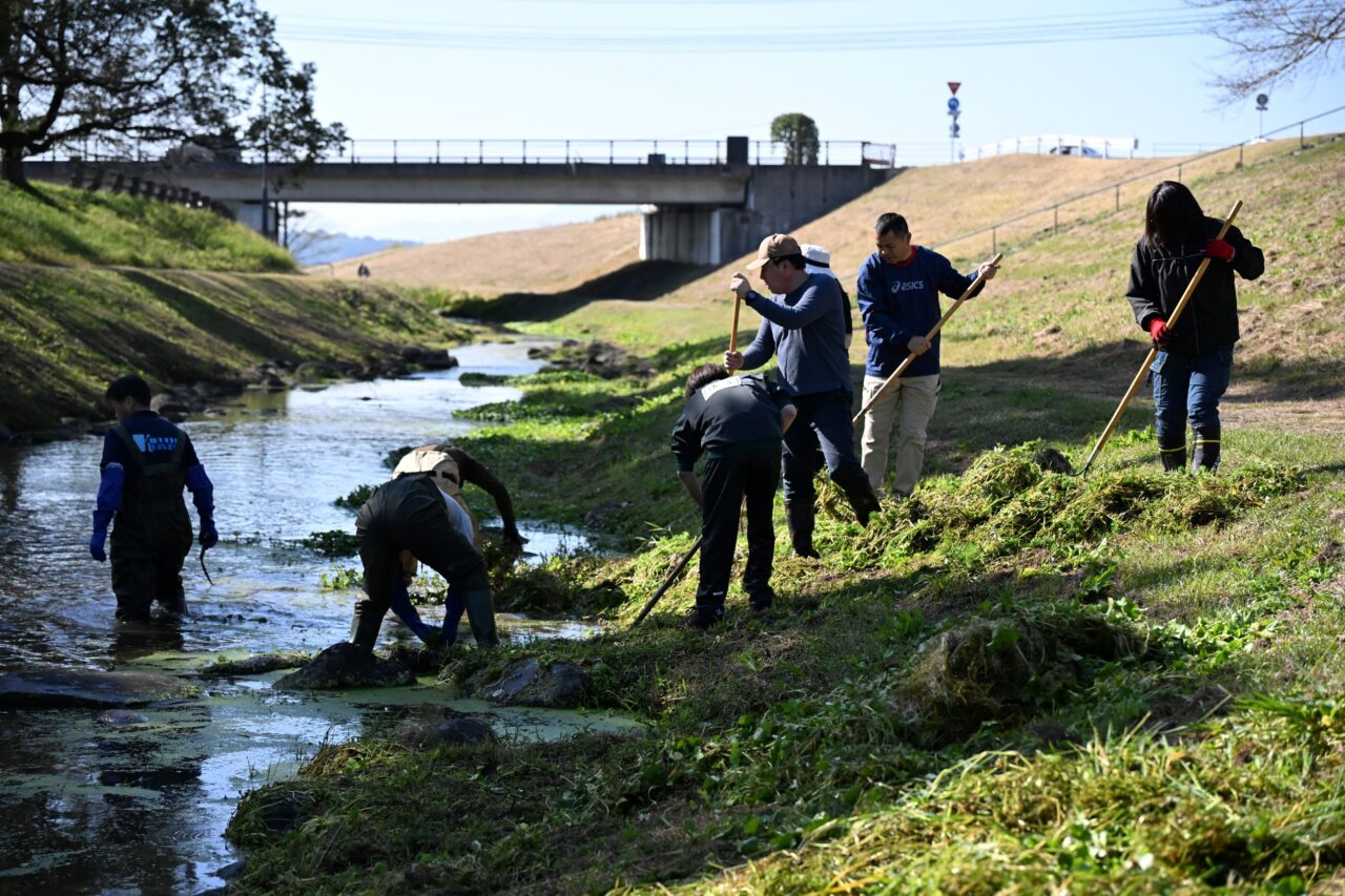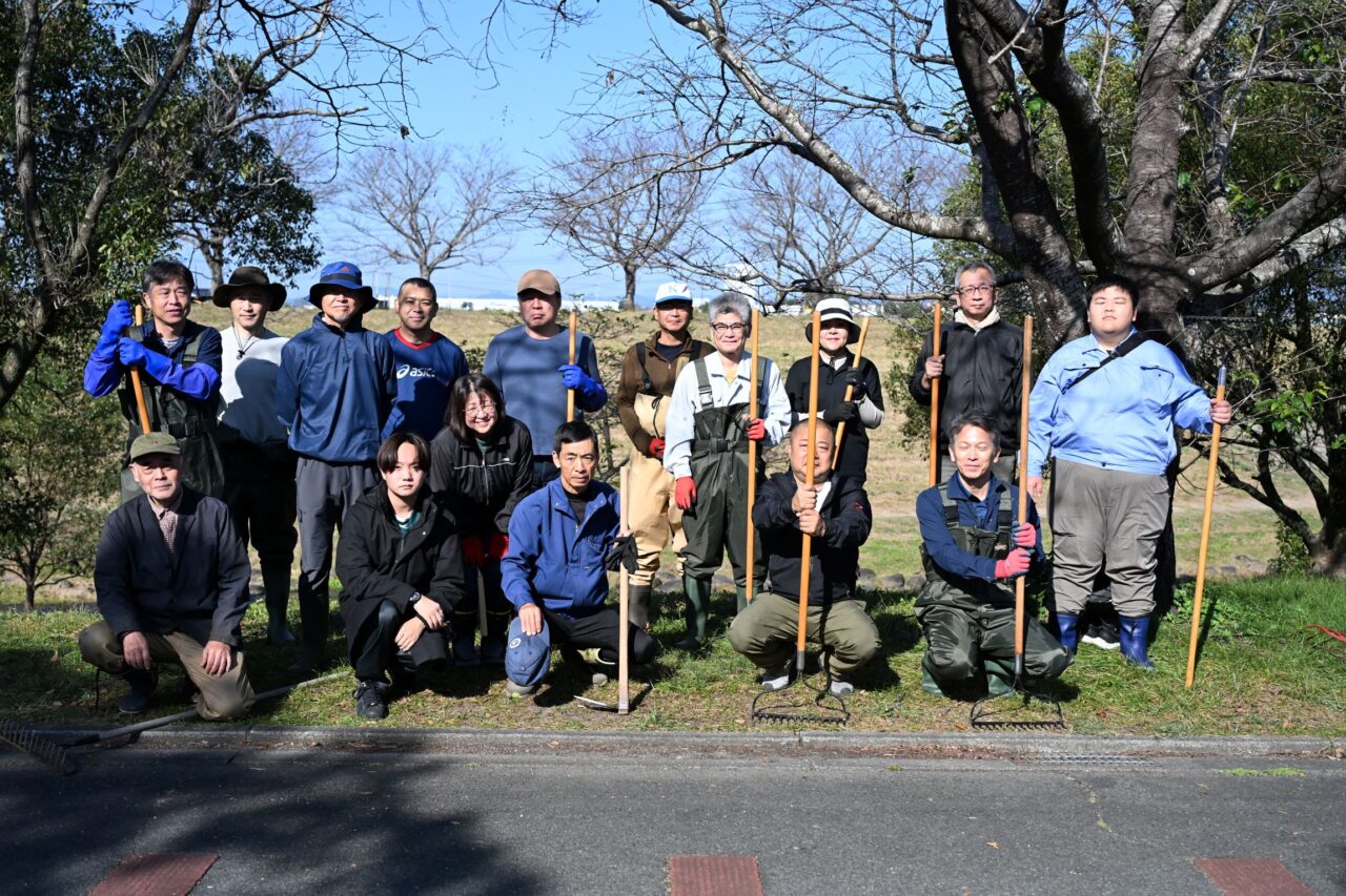 今年も「水辺プラザかもと」にて実施、菊池川河川事務所の皆さんにもお手伝いいただき、総勢19名にて作業を行いました。